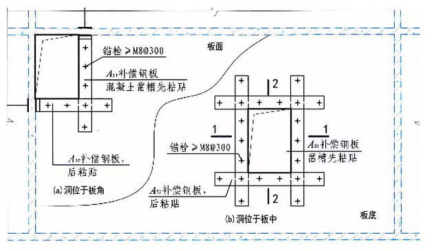 现浇连续板开洞,当开洞位置位于板的负弯矩区时,采用粘钢作为补偿加固时,应双面加固。对于粘贴钢板加固法,受力较大方向宜粘贴在最外层(其含义就是最后粘贴),受力较小方向钢板钢板粘贴于里层(最先进行粘贴)。此时,先粘钢板应于混凝土贴面处开槽,开槽厚度≥钢板厚度+3mm,以保证先粘钢板面与楼板地面齐平。亦可双向齐平粘贴,但需将受力较小方向钢板切成三段,现场焊接,局部后灌胶粘剂。