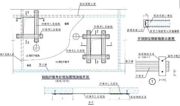 开洞后板面筋的减少,导致承载力降低,因此应对开洞后的楼板进行内力分析和承载力验算之后,再结合楼板性质、开洞大小及形状等差异,分别采用合适的加固处理方法。接下来施邦为大家介绍粘钢或碳纤维布这两种常用的加固措施供大家参考。