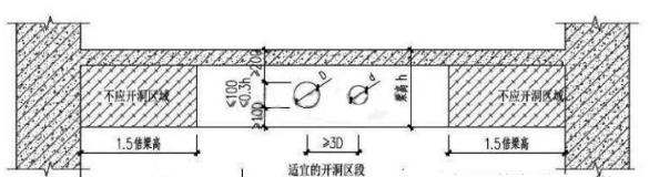 3)洞口下缘应至少距梁底10公分以上,以免损伤或打断梁底钢筋;(只针对住宅楼梁,如果碰到跨度大,截面大的梁,应距离更远)